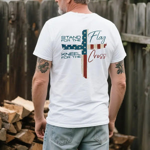 The front design features a striking cross filled with the stars and stripes of the USA flag. On the back, the same patriotic cross is paired with the inspiring message “Stand For The Flag Kneel For The Cross.”