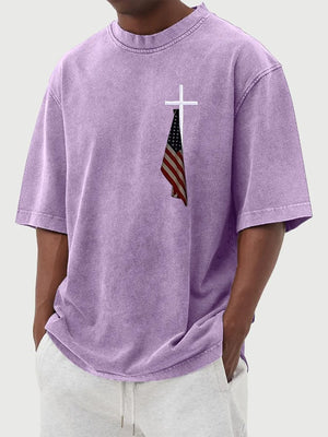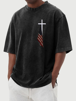 Men's Vintage Flag Cross Print Cotton Washed T-Shirt
