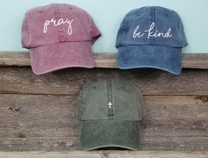 Pigment dyed dad hat with tiny embroidered cross, baseball hat, handwritten. Faith, Christian embroidered unstructured hat