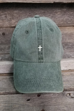 This listing is for a forest pigment dyed dad hat w/tiny embroidered cross in ivory thread.
