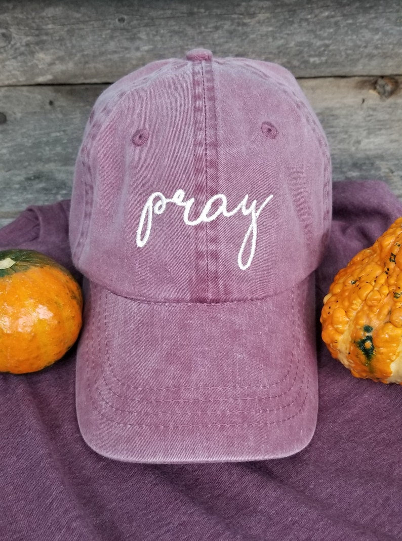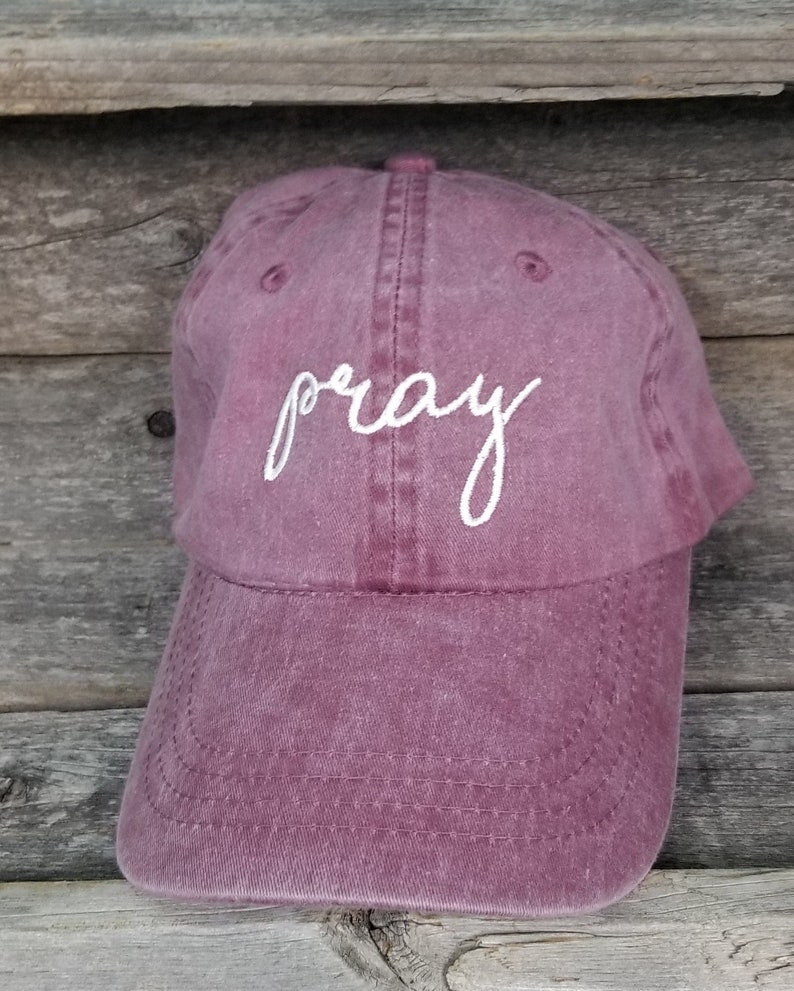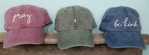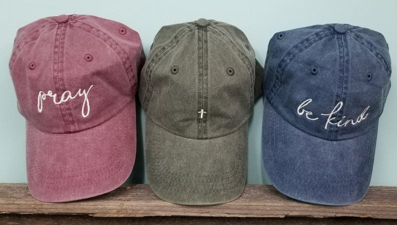 Show your faith with several of our other Christian designed hats. Other listings include Pray, Be Kind, tiny cross and not today satan. All are done in ivory thread on your choice of dad hat-maroon, hunter or navy.