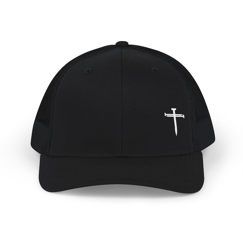 Show your faith in style with our Embroidered Cross 3 Nail Hats — the perfect blend of bold faith and everyday wear. Featuring a minimalist yet powerful 3-nail cross design, this classic trucker hat offers a premium embroidered detail on the front left panel.
