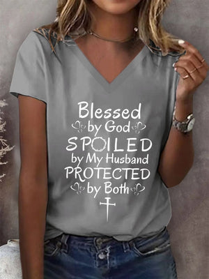 Women's Blessed by God Spoiled by my Husband Protected by Both Print T-Shirt