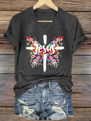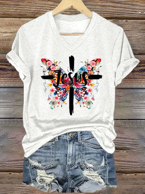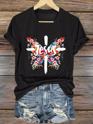 Women's Jesus Butterfly Cross Print Short Sleeve T-Shirt