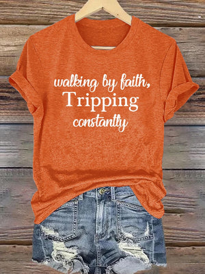 Women's Walking By Faith Tripping Constantly Print T-Shirt